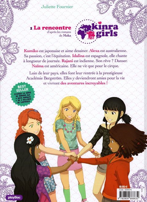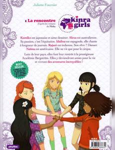 Dans le tome 1 Kumiko aime dessiner. Alexa est championne d'équitation. Rajani danse, Idalina chante, et Naïma est une artiste de cirque. Toutes sont issues des 4 coins du monde... Et toutes font leur entrée à l'Académie Internationale Bergström. Loin de chez elles, elles vont découvrir leurs différentes cultures, et devenir amies pour la vie... Mais ça n'est pas si simple de s'acclimater à une nouvelle vie, même quand on a une super bande de copines et des cours passionnants. Idalina peine à montrer ses talents au cours de chant. Rajani a une prof de danse à l'exigence qui ferait douter même les meilleures... Quant à Naïma, elle devrait se méfier de cette peste de Ruby et de sa bande. Heureusement qu'Alexa, l'australienne intrépide et pleine d'imagination, a décidé de partager avec elles son secret : un code secret qui leur permettra de se parler sans être comprises des autres. Ca y est, la bande des KINRA GIRLS est née ! Un tome d'exposition et la naissance d'une solide amitié autour de valeurs fortes et positives qui plairont au jeune public et à leurs parents ! Le petit plus : un très bel ex-libris constituant la première pièce d'une frise offert dans le tome 1.