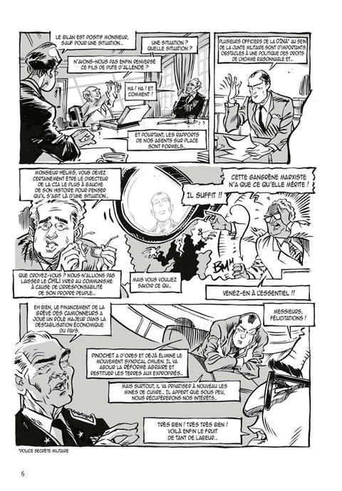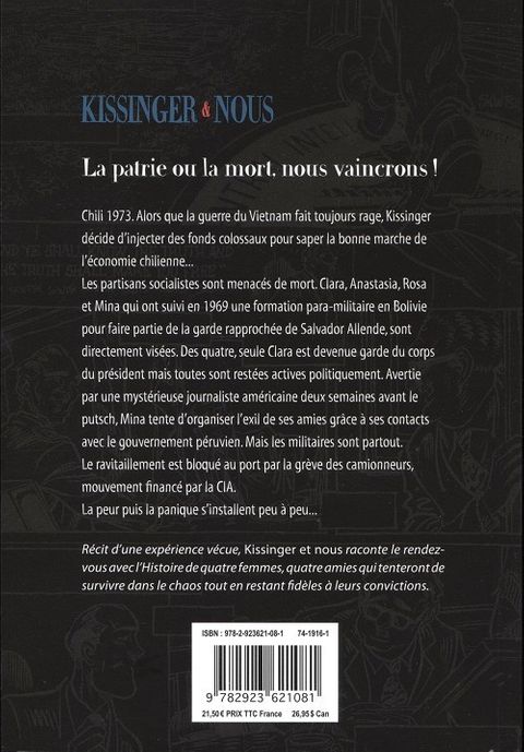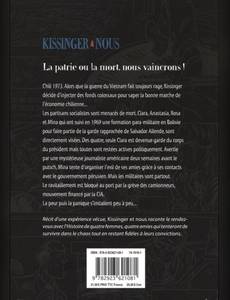 Chili, 1973. Alors que la guerre du Vietnam fait toujours rage, Kissinger décide d'injecter des fonds colossaux pour saper la bonne marche de l'économie chilienne. Un coup d'état se prépare... Les partisans socialistes sont menacés de mort. Clara, Anastasia, Rosa et Mina, qui ont suivi en 1969 une formation pour faire partie de la garde rapprochée de Salvador Allende, sont directement visées. Deux semaines avant le putsch, grâce à ses contacts avec le gouvernement péruvien, Mina tente d'organiser l'exil de ses amies. Mais les militaires sont partout. Le ravitaillement est bloqué au port par la grève des camionneurs, mouvement financé par la C.I.A. La peur, puis la panique, s'installent peu à peu... Kissinger et nous raconte le rendez-vous avec l'Histoire de quatre femmes, quatre amies. Ce récit est tiré d'une expérience vécue.