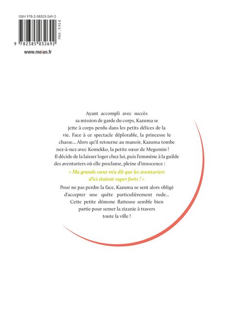 La petite soeur de l'archimageAyant accompli avec succès sa mission de garde du corps, Kazuma se jette à corps perdu dans les petits délices de la vie. Face à ce spectacle déplorable, la princesse le chasse... Alors qu'il retourne au manoir, Kazuma tombe nez-à-nez avec Komekko, la petite soeur de Megumin !Il décide de la laisser loger chez lui, puis l'emmène à la guilde des aventuriers où elle proclame, pleine d'innocence : " Ma grande soeur m'a dit que les aventuriers d'ici étaient super forts ! "Pour ne pas perdre la face, Kazuma se sent alors obligé d'accepter une quête particulièrement rude... Cette petite démone flatteuse semble bien partie pour semer la zizanie à travers toute la ville !