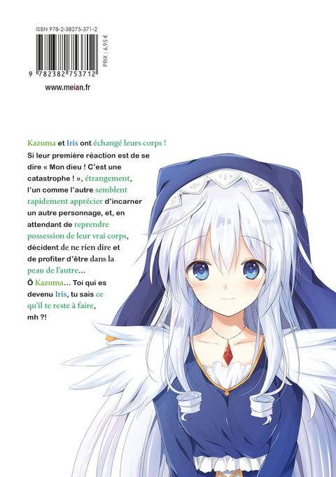 Kazuma et Iris ont échangé leurs corps ! Si leur première réaction est de se dire " Mon dieu ! C'est une catastrophe ! ", étrangement, l'un comme l'autre semblent rapidement apprécier d'incarner un autre personnage, et, en attendant de reprendre possession de leur vrai corps, décident de ne rien dire et de profiter d'être dans la peau de l'autre...Ô Kazuma... Toi qui es devenu Iris, tu sais ce qu'il te reste à faire, mh ?!