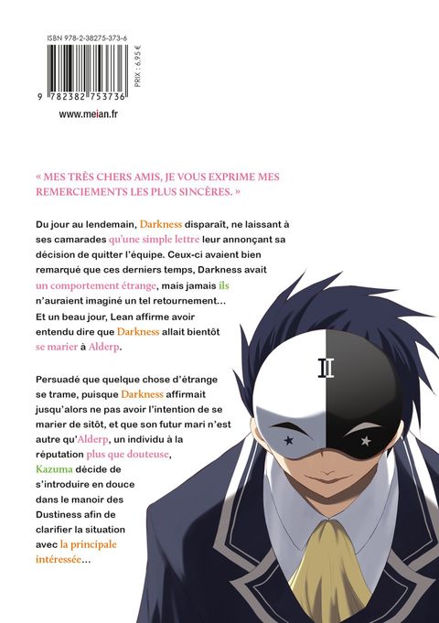 "Mes très chers amis, je vous exprime mes remerciements les plus sincères."Du jour au lendemain, Darkness disparaît, ne laissant à ses camarades qu'une simple lettre leur annonçant sa décision de quitter l'équipe. Ceux-ci avaient bien remarqué que ces derniers temps, Darkness avait un comportement étrange, mais jamais ils n'auraient imaginé un tel retournement... Et un beau jour, Lean affirme avoir entendu dire que Darkness allait bientôt se marier à Alderp.Persuadé que quelque chose d'étrange se trame, puisque Darkness affirmait jusqu'alors ne pas avoir l'intention de se marier de sitôt, et que son futur mari n'est autre qu'Alderp, un individu à la réputation plus que douteuse, Kazuma décide de s'introduire en douce dans le manoir des Dustiness afin de clarifier la situation avec la principale intéressée...