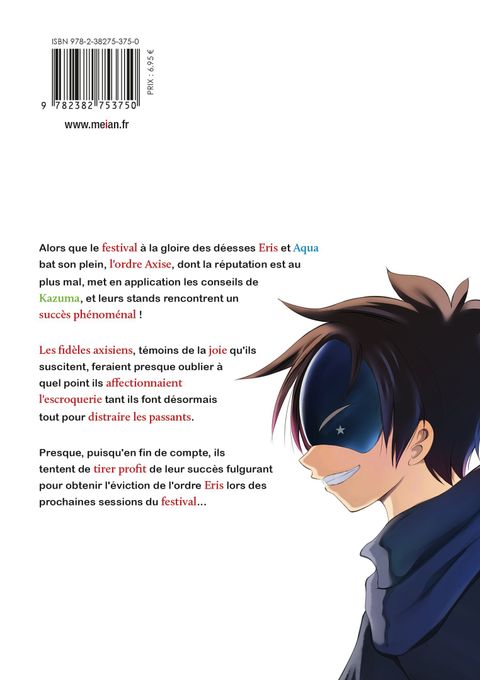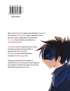Alors que le festival à la gloire des déesses Eris et Aqua bat son plein, l'ordre Axise, dont la réputation est auplus mal, met en application les conseils de Kazuma, et leurs stands rencontrent un succès phénoménal !Les fidèles axisiens, témoins de la joie qu'ils suscitent, feraient presque oublier à quel point ils affectionnaient l'escroquerie tant ils font désormaistout pour distraire les passants.Presque, puisqu'en fin de compte, ils tentent de tirer profit de leur succès fulgurant pour obtenir l'éviction de l'ordre Eris lors des prochaines sessions du festival...
