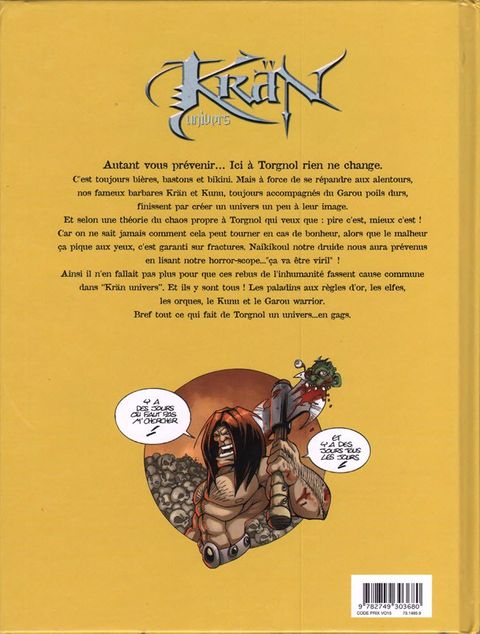 Du Krän Sang pour cent poilant ! Déclinaison sous forme de gags en une page de la célèbre parodie d'heroïc fantasy Krän le Barbare, Krän Univers reprend les ingrédients qui ont fait le succès de la série : un barbare aussi fort que stupide, un ton décalé à la Monthy Python, des chevaliers débiles et des monstres méchants comme s'il en pleuvait. Les aficionados du barbare à la hache y retrouveront avec plaisir leur héros favori accompagné de son fidèle Kunu et de son garou familier !