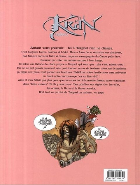 Des gags en une page. Mais toujours autant d'humour sauvage, de décapitations sanglantes, de créatures débiles et de coups de hache ! Une réussite parfaite, dans la lignée de la série culte créée par Éric Hérenguel ! Vous croyiez avoir tout lu de Krän ? Assisté à tous ses moulinets de hache ? Vu toutes les têtes tomber et tous les monstres rendre gorge ? Eh bien non. Car entre chaque épisode des aventures parodiques du barbare le plus déjanté de la planète fantasy se cachaient mille et un petits faits de guerre et autres traits d'humour que Kran Univers a décidé d'offrir aux fans affamés du héros d'Éric Hérenguel, animé ici par Pierre Loyvet. Enfilez votre armure. Enfoncez votre casque et chauffez-vous les zygomatiques ! Ça va saigner !