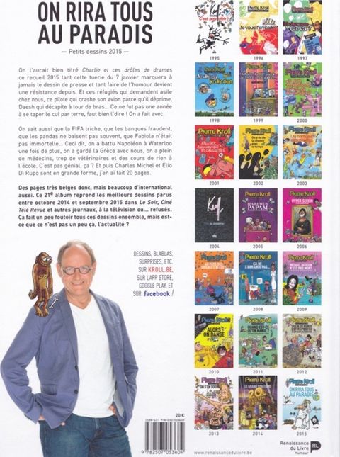 On l'aurait bien titré Charlie et ces drôles de drames ce recueil 2015 tant cette tuerie du 7 janvier marquera à jamais le dessin de presse et tant faire de l'humour devient une résistance depuis. Et ces réfugiés qui demandent asile chez nous, ce pilote qui crashe son avion parce qu’il déprime, Daesh qui décapite à tour de bras... Ce ne fut pas une année à se taper le cul par terre, faut bien l’dire ! On a fait avec. On sait aussi que le Fifa triche, que les banques fraudent, que les pandas ne baisent pas souvent, que Fabiola n’était pas immortelle... Ceci dit, on a battu Napoléon à Waterloo une fois de plus, on a gardé la Grèce avec nous, on a plein de médecins, trop de vétérinaires et des cours de rien à l’école. C’est pas génial, ça ? Et puis Charles Michel et Elio Di Rupo sont en grande forme, j’en ai fait 20 pages. Des pages très belges donc, mais beaucoup d’international aussi. Ce 21e album reprend les meilleurs dessins parus dans Le Soir, Cinétélérevue et autres journaux, à la télévision ou... refusés entre octobre 2014 et octobre 2015. Ça fait un peu foutoir tous ces dessins ensemble, mais est-ce que ce n’est pas un peu ça l’actualité ?