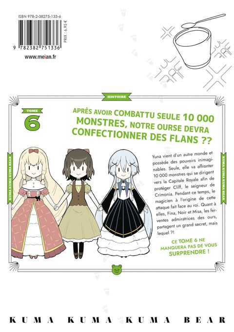 Après avoir combattu seule 10 000 monstres, notre ourse devra confectionner des flans ??Yuna vient d'un autre monde et possède des pouvoirs inimaginables. Seule, elle va affronter 10 000 monstres qui se dirigent vers la Capitale Royale afin de protéger Cliff, le seigneur de Crimonia. Pendant ce temps, le magicien à l'origine de cette attaque fait face au roi. Quant à elles, Fina, Noir et Misa, les ferventes admiratrices des ours, partagent un grand secret, mais lequel ?!