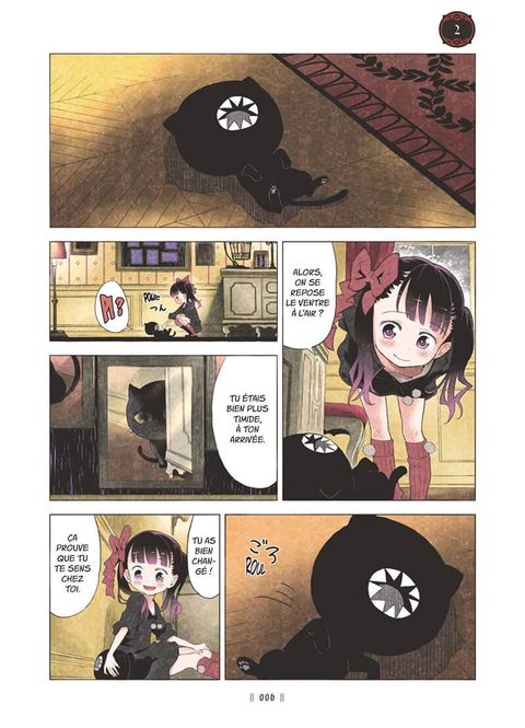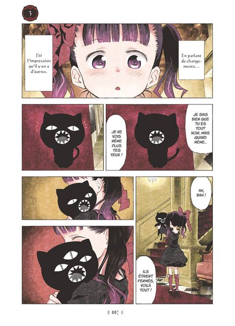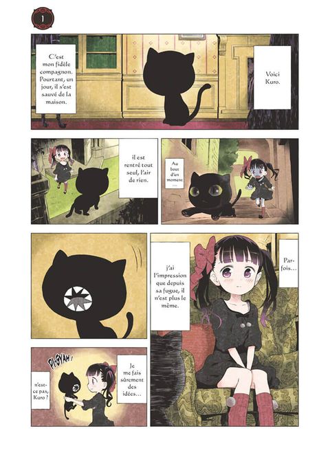 Le petit chat noir comme de la suie.Koko est une petite fille qui vit dans un manoir avec son chat noir Kuro. Un jour, Kuro s'enfuit de la maison. Quand il revient, il est toujours aussi joueur, affectueux et câlin… mais pourtant, quelque chose semble différent en lui. Serait-ce à cause de ses petits crocs acérés ? Ou de ses yeux un peu trop… nombreux ? Et dehors, d'effrayants monstres tout noirs rôdent dans la forêt…Première série du duo So-ma-to avant Shadows House, Kuro nous entroduit dans l'univers de conte de fée cher à nos auteurs. Certaines pistes nous poussent d'alleurs à croire que les deux œuvres ont lieu dans le même monde.Série complète en 3 tomes, chaque tome compte la moitié de ses pages colorisées pour vous permettre de profiter de toute la beauté de l'univers gothique et kawaii créé par So-ma-to.