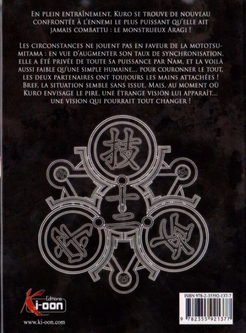 En plein entraînement, Kuro se trouve de nouveau confrontée à l'ennemi le plus puissant qu'elle ait jamais combattu : le monstrueux Aragi ! Les circonstances ne jouent pas en faveur de la Mototsumitama : en vue d'augmenter son taux de synchronisation, elle a été privée de toute sa puissance par Nam, et la voilà aussi faible qu'une simple humaine... Pour couronner le tout, les deux partenaires ont toujours les mains attachées ! Bref, la situation semble sans issue. mais, au moment où Kuro envisage le pire, une étrange vision lui apparaît... Une vision qui pourrait tout changer !