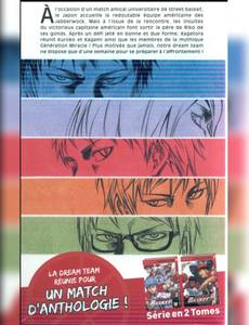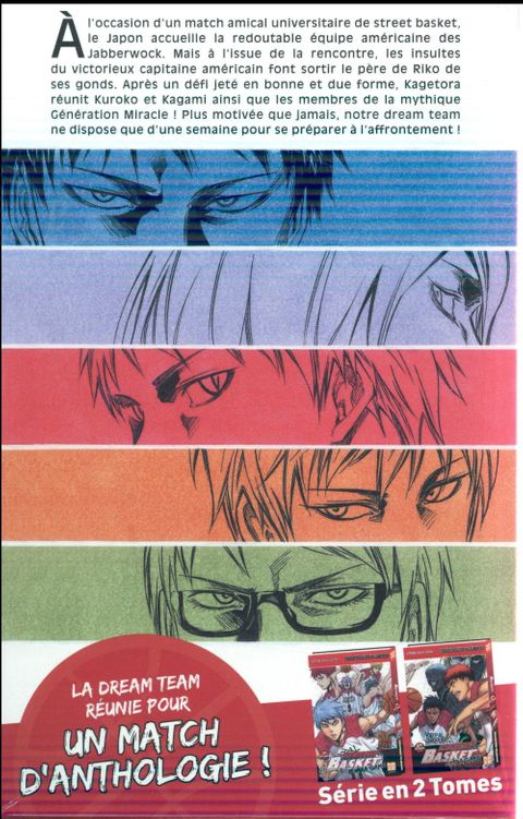 A l'occasion d'un match amical universitaire de street basket, le Japon accueille la redoutable équipe américaine des Jabberwock. Mais à l'issue de la rencontre, les insultes du victorieux capitaine américain font sortir le père de Riko de ses gonds. Après un défi jeté en bonne et due forme, Kagetora réunit Kuroko et Kagami ainsi que les membres de la mythique Génération Miracle ! Plus motivée que jamais, notre dream team ne dispose que d'une semaine pour se préparer à l'affrontement ! Coffret exclusif avec un tirage limite´ avec les T1 & T2 soit l'inte´grale de la se´rie.