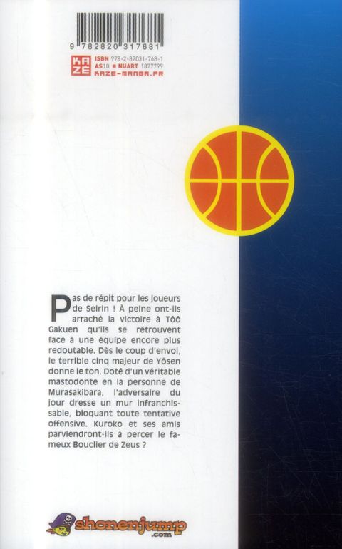 En quarts de finale, le match qui oppose Seirin au redoutable cinq majeur de Yôsen est sur le point de commencer. Kuroko et ses amis seront confrontés à un jeu d'une toute autre envergure. Parviendront-ils à briser le fameux Bouclier de Zeus qui se dressent devant eux ? D'autant que Kagami va devoir faire face à celui qu'il considérait comme son grand frère : Himuro !