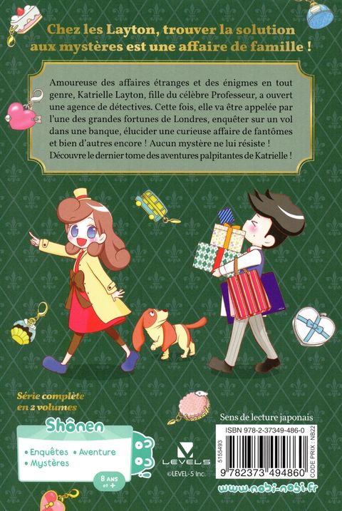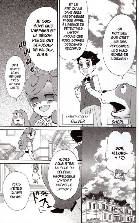 Katrielle, la fille du célèbre Professeur Layton, a ouvert l’agence de détectives Layton sur Chancer Lane à Londres. Amoureuse des mystères et des énigmes en tous genres, elle résout les affaires qu’on lui confie avec l’aide d’Oliver, son assistant et de Sherl, le chien qui parle. Accompagne Katrielle et ses amis dans leurs aventures et toi aussi, relève les défis qui se présentent en bonus de ce manga !