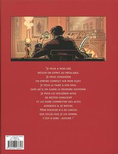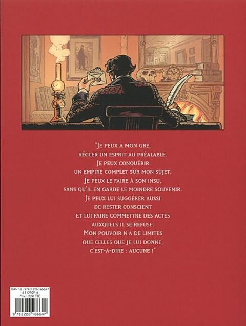 " Je peux à mon gré, régler un esprit au préalable. Je peux conquérir un empire complet sur mon sujet. Je peux le faire à son insu, sans qu'il en garde le moindre souvenir. Je peux lui suggérer aussi de rester conscient et lui faire commettre des actes auxquels il se refuse. Mon pouvoir n'a pas de limites que celle que je lui donne, c'est-à-dire : aucune ! "