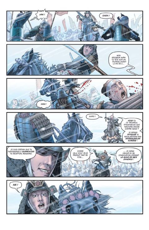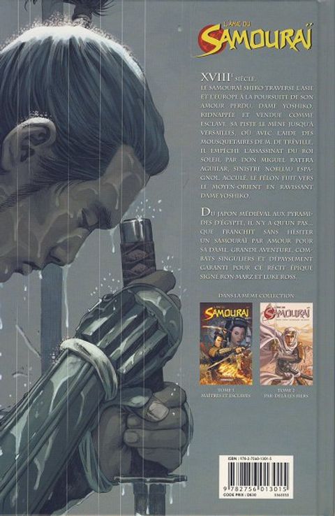 XVIIIe siècle. Le samouraï shiro traverse l'Asie et l'Europe à la poursuite de son amour perdu, dame yoshiko kidnappée et vendue comme esclave. Sa piste le mène jusqu' Versailles, où avec l'aide des mousquetaires de M. De Treville il empêche l'assassinat du roi soleil par don Miguel Ratera Aguilar, sinistre nobliau espagnol. Acculé, Le félon fuit vers le Moyen-Orient en ravissant dame yoshiko. Du japon médiéval aux pyramides d'Egypte, il n'y a qu'un pas... Que franchit sans hésitez un samouraï par amour pour sa dame. Grande aventure, combats singuliers et dépaysement garanti pour ce récit épique signé Ron Marz et Luke Ross.