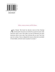 Alors, nous avons volé la lune.Adieu, Kôsuke. Tels furent les derniers mots de Koto Kisaragi avant de partir. Si je pars à sa recherche, je pourrai sauver cette personne chère à mon coeur. Mais si je pars, je blesserai une autre personne chère à mon coeur. Tout n'est pas zéro ou cent. Tout n'est pas noir ou blanc. Dans ce dégradé de nuances allant de la normalité à l'anormalité, comment savoir où placer le curseur ?