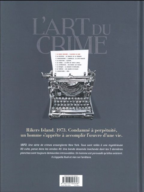 Manhattan, 1972. Art Blumenfeld, un vieux milliardaire philanthrope qui a fait fortune dans le cinéma, envoie une lettre à Nora Hathaway, une jeune métisse indienne, pour la presser de venir le retrouver à New York. À l'intérieur de l'enveloppe se trouve également l'exemplaire d'une BD culte parue dans les années 1940 : La Piste de Mesa Verde, dont l'auteur Curtis Lowell est mort accidentellement. Un album inachevé qui nourrit depuis des années l'obsession de Rudi Boyd Fletcher. Lorsque Nora arrive chez Blumenfeld, le vieil homme est déjà mort, victime de la folie d'un homme et de sa quête sanglante... Arrêtée par la police et accusée du crime, Nora ne pourra compter que sur un homme : John Stoner dit Snail, un flic atypique. Il est le seul à la croire. Mais pour la sauver, Snail va devoir pourchasser Rudi et pour cela, partir lui aussi à la recherche des cinq planches manquantes. Si elles existent... Neuf arts. Neuf crimes. Une vie. Rikers Island. Etats-Unis. 1973. Du fond de sa cellule, un serial killer condamné à perpétuité va aller au bout d'un projet narratif unique et insensé : 9 arts, 9 crimes, 9 histoires. À travers une série de 9 albums qui explorent la fièvre créatrice quand elle devient vertige et engendre la folie meurtrière, L'Art du Crime va devenir le projet fou de cet homme, Rudi Boyd Fletcher. Chaque album nous décrit une intrigue criminelle liée à l'un des 9 arts majeurs : peinture, littérature, sculpture, cinéma, musique, architecture, théâtre, audiovisuel et, bien entendu, bande dessinée. Chaque tome, réalisé par un dessinateur différent, possède ainsi son propre univers puisqu'il se déroule dans des lieux et époques variées. Mais au fur et à mesure des albums va se dessiner une arche narrative d'ensemble - du jamais vu en bande dessinée -, qui se révèlera pleinement au tome 9 et offrira à Rudi la liberté et la rédemption, dans une ultime révélation...