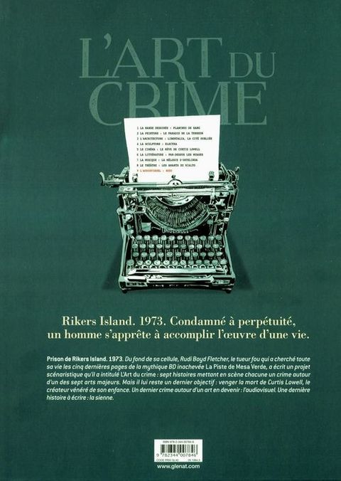 Une dernière histoire à écrire... Prison de Ryker's Island. 1973. Du fond de sa cellule, Rudi Boyd Fletcher, le tueur fou qui a cherché toute sa vie les cinq dernières pages de la mythique BD inachevée La Piste de Mesa Verde, a écrit un projet scénaristique qu'il a intitulé L'Art du Crime : 7 histoires mettant en scène 7 crimes autour d'un des 7 arts majeurs. Mais il lui reste un dernier objectif : venger la mort de Curtis Lowell, le créateur vénéré de son enfance, assassiné par le producteur de télévision Frank Blumenfeld. Un dernier crime autour d'un art en devenir : l'audiovisuel. Une dernière histoire à écrire : la sienne.L'Art du crime, projet artistique de 9 volumes plus qu'ambitieux, livre enfin toutes les clés de son architecture narrative complexe. Découvrez la conclusion d'une série unique en son genre dans l'histoire de la bande dessinée. À travers l'art, Rudi trouvera sa rédemption... ou sa damnation.