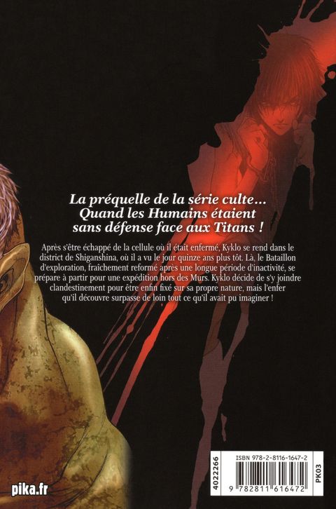 Après s'être échappé de la cellule où il était enfermé, Kyklo se rend dans le district de Shiganshina, où il a vu le jour quinze ans plus tôt. Là, le Bataillon d'exploration, fraîchement reformé après une longue période d'inactivité, se prépare à partir pour une expédition hors des murs. Kyklo décide de s'y joindre clandestinement pour être enfin fixé sur sa propre nature, mais l'enfer qu'il découvre surpasse de loin tout ce qu'il avait pu imaginer !