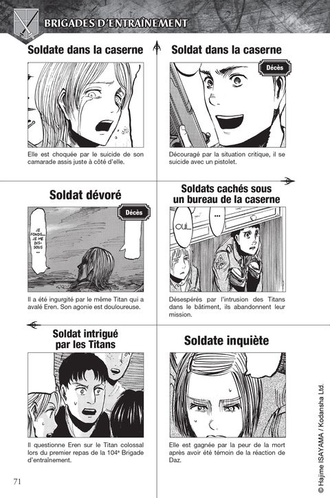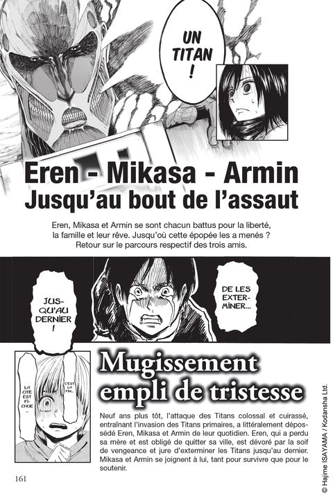 Retrouvez tous les personnages du début à la fin de l’épopée de L’Attaque des Titans, des membres du Bataillon d’exploration jusqu’aux citoyens anonymes. Cet ouvrage est un véritable condensé de la mémoire de l’Humanité et de son combat pour sa survie ! Un guide exhaustif contenant les données de plus de 300 personnages, de nouvelles informations révélées sur les personnages principaux, ainsi qu’une interview inédite de Hajime Isayama après la parution du dernier chapitre de L’Attaque des Titans ! Ce guide est paru au Japon en même temps que le dernier tome de la série en juin 2021. Il reprend le contenu Shingeki no Kyojin Character Book publié en août 2017 avec des pages supplémentaires ainsi que des informations complémentaires sur certains personnages. Ce guide est donc la version ultime et finale du guide des personnages de la série.