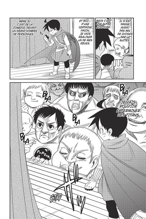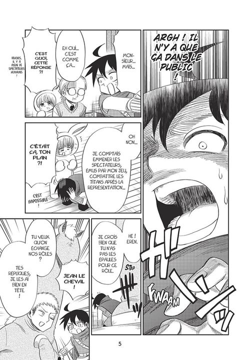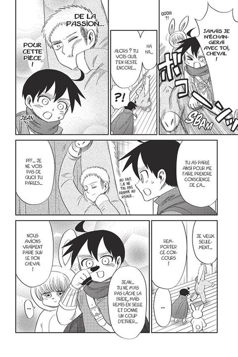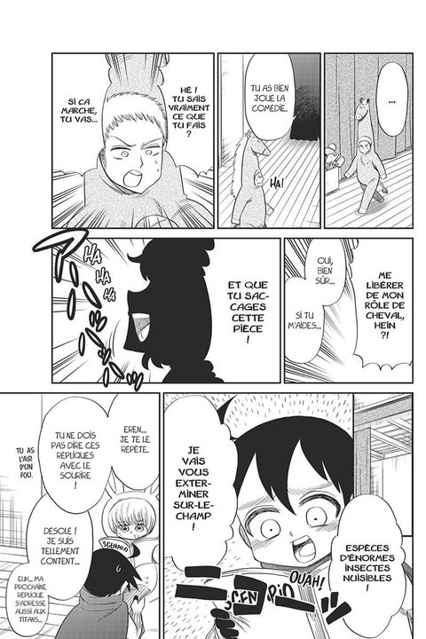 Il n'y a que des Titans parmi les spectateurs ?! Le "prince Eren" a disparu ?! Pourquoi la "princesse" est-elle si baraquée ?! Le rideau se lève sur le grand concours de théâtre et sur le mystère de l'école ! Mais serait-ce un combat perdu d'avance... ?