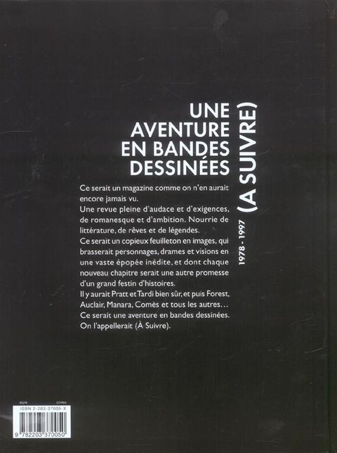 Ce serait un magazine comme on n'en aurait encore jamais vu. Une revue pleine d'audace et d'exigences, de romanesque et d'ambition. Nourrie de littérature, de rêves et de légendes. Ce serait un copieux feuilleton en images, qui brasserait personnages, drames et visions en une vaste épopée inédite, et dont chaque nouveau chapitre serait une autre promesse d'un grand festin d'histoires. Il y aurait Pratt et Tardi bien sur, et puis Forest, Auclair, Manara, Comès et tous les autres... Ce serait une aventure en bandes dessinées. On l'appellerait (À Suivre).