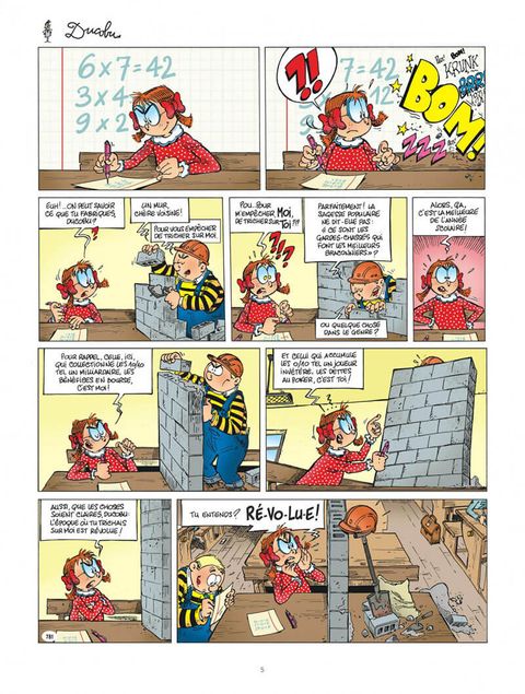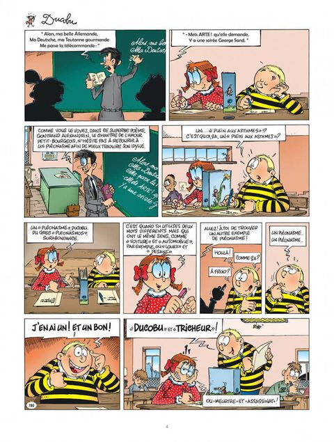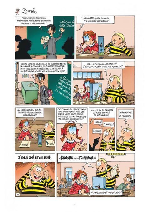 En bon cancre, Ducobu n'en aime pas moins la langue française et ses figures de style quand elles lui permettent de parvenir à ses fins. Pour rendre chèvre l'instit Latouche, il n'hésite pas à faire montre d'un sens de la dialectique propre à en décourager plus d'un. Et quand il est question de changer la sacrosainte dictée de « La cueillette aux champignons » pour la remplacer par une pièce inédite rédigée par Léonie Gratin, il se montre le plus fervent défenseur des allitérations. Ducobu, un tricheur ? Ne serait-ce pas un pléonasme ?