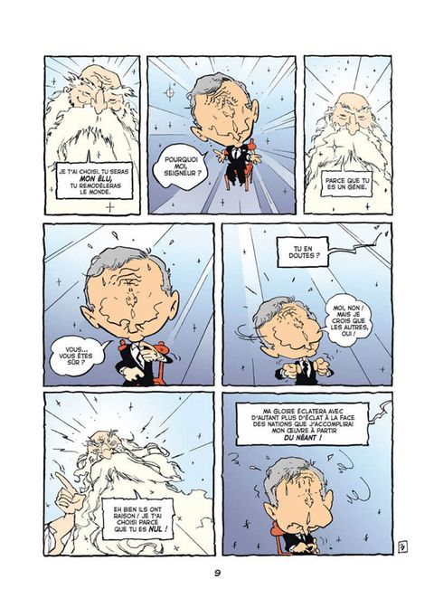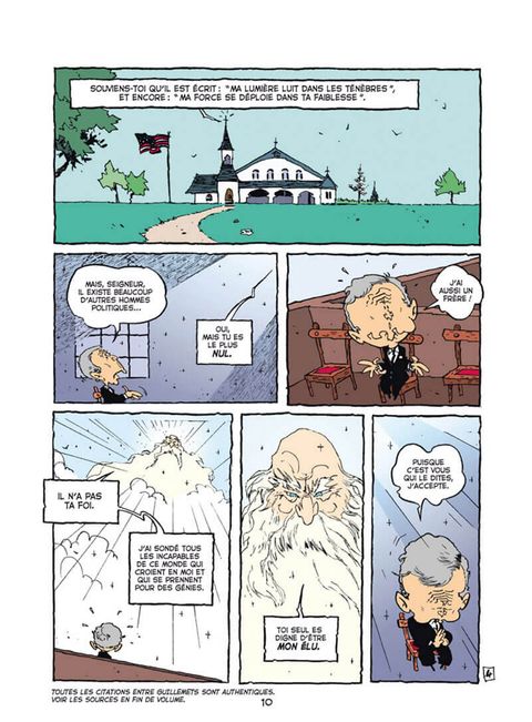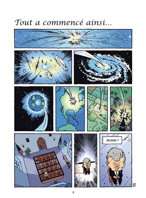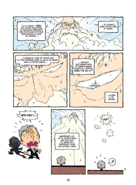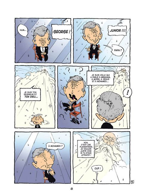 Dieu en personne apparaît à George W. Bush et lui ordonne de travailler pour lui… Une tentative d’explication teintée au vitriol des dérives du gouvernement américain depuis 2000.Comment George Walker Bush, membre du parti républicain, deux fois gouverneur du Texas et fils d’un ancien président des États-Unis, a-t-il réussi à se faire élire lui-même président ? Quelle idéologie sous-tend l’action de son administration quand elle déclare la « guerre contre le Mal » ? Les réponses à ces questions peuvent paraître complexes à saisir mais, grâce à Lenoir et Chabert, les voici qui deviennent « drôlement » plus claires. En révélant les entrevues privées du président américain avec son Créateur, mais plus étonnant encore, grâce à un cours de sociologie humaine donné par un professeur extraterrestre, le lecteur comprendra enfin le sens des choses. Un portrait impertinent de George Bush, qui mêle habilement satire politique et étude stricte des faits, un humour noir et décapant qui permet de voir le monde autrement. ALBUM CARTONNÉ • 64 PAGES COULEURS • FORMAT : 21,5 X 29,3 CM