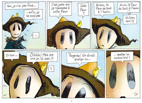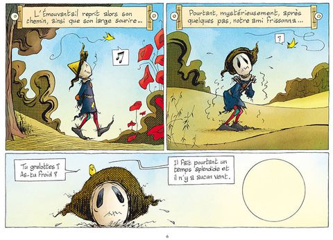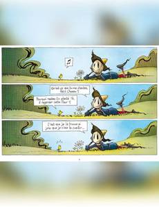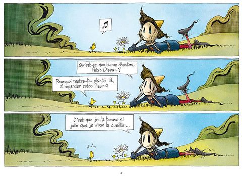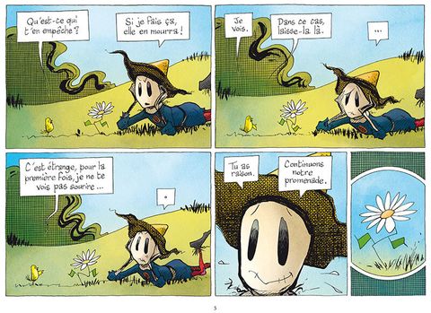 « Cette histoire s'est déroulée, sans doute, loin d'ici, mais peut-être, près de chez vous... » Lors d'une promenade champêtre, l'Émouvantail et son ami Petit Oiseau découvrent une fleur pas comme les autres, une fleur qui ressemble à une femme épouvantail... quelqu'un comme lui. Mais cette dernière est profondément endormie au milieu du champ. L'Émouvantail, grâce à un bouquet de fleurs, souhaite l'éveiller en douceur. Hélas, ce stratagème ne fonctionne pas. Petit Oiseau décide de lui en venir en aide en allant chercher conseil auprès de l'Ancien, un sage hibou !
