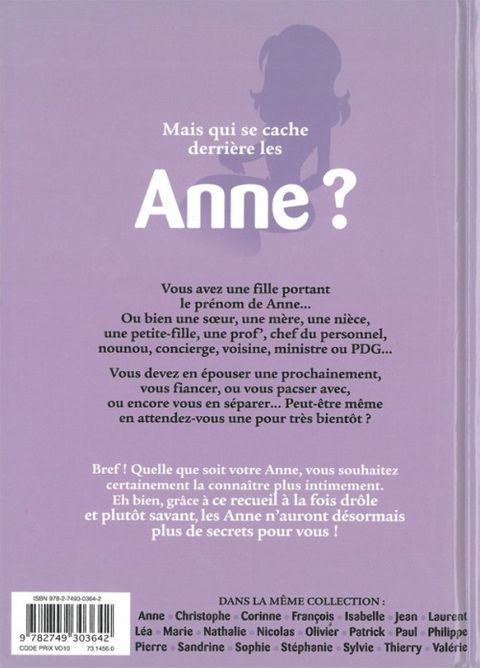 Votre prénom a du sens ! Avec la première série de L'encyclopédie des prénoms en bande dessinée, Vents d'Ouest lançait un nouveau type de BD, aussi inépuisable qu'indispensable ! Voici quatre nouveaux ouvrages dans lesquels vous allez découvrir tout ce qu'il y a à savoir, avec un humour toujours aussi décapant, sur les François, Paul, Anne et Léa Découvrez, pour chacun de ces prénoms, ses origines, ses défauts, ses particularités, ses qualités Mais aussi quelles sont ses forces, ses faiblesses, ses passions, et ses amours. Cette collection d'un nouveau genre se présente comme le cadeau idéal pour les anniversaires, les fêtes ou juste pour le plaisir Car un prénom, c'est pour la vie, et il en dit souvent long sur notre personn alité !