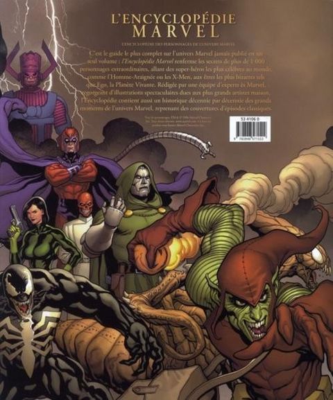 Le guide le plus complet sur l'univers Marvel jamais publié en un seul volume : L'Encyclopédie Marvel renferme les secrets de plus de 1 000 personnages extraordinaires, allant des super-héros les plus célèbres au monde, comme Spider-Man ou les X-Men, aux êtres les plus bizarres tels que Ego, la Planète Vivante. Rédigée par une équipe d'experts ès Marvel, regorgeant d'illustrations spectaculaires dues aux plus grands artistes maison, l'Encyclopédie contient aussi un historique décennie par décennie des grands moments de l'univers Marvel, reprenant des couvertures d'épisodes classiques.