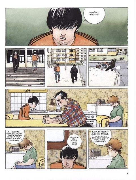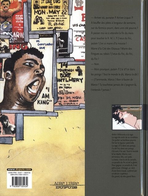 - arriver où, punaise oe! arriver à quoi oe! à bouffer des pâtes à longueur de semaine, sur du formica pourri, dans une cité pourrie ? à passer ma vie à attendre la fin du mois pour toucher le r.m.i. oe! j'veux du fric, putain ! j'en ai marre d'la mouise ! marre d'la cité des oiseaux ! marre des fringues au rabais ! j'veux du fric, du fric, du fric ! - non. - mais pourquoi, putain oe! j'ai d'l'or dans les poings ! tout le monde le dit, marco le dit ! - j'l'emmerde, marco ! rien à foutre de marco ! tu toucheras jamais de c'pognon-là, t'entends ! jamais ! anton witkowsky a la rage. la rage de sortir de sa condition. de quitter sa banlieue pourrie. de fuir la rigueur paternelle. la rage, il l'a dans ses poings. il a de l'or, dans ses poings, il le sent, il le sait. tout le monde le lui répète, marco, son entraîneur, mo, son pote. la boxe, c'est la clé du paradis. le paradis du fric et de la gloire. pour gagner ce paradis-là, il est prêt à tout. l'enragé, un récit d'une force inouïe, sublimé par un dessin supérieur. du grand, du très grand baru.