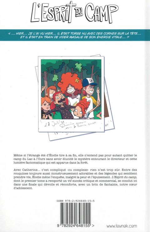 Même si l'étrange été d'Élodie tire à sa fin, elle n'entend pas pour autant quitter le Camp du Lac à L'ours sans avoir élucidé le mystère entourant le directeur et cette lumière fantomatique qui est apparue dans la forêt. Avec Catherine... c'est compliqué -ou complexe- rien n'est trop sûr, mais entre des rouquines toujours aussi monstrueusement adorables et des légendes qui semblent prendre vie, Élodie mène l'enquête, malgré la peur et l'épuisement. L'Esprit du Camp, dont le premier tome a remporté un vif succès critique et commercial, se conclus ici dans une finale qui dévoile et réconforte, avec un brin de fantaisie, notre coeur d'adolescent.