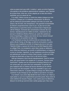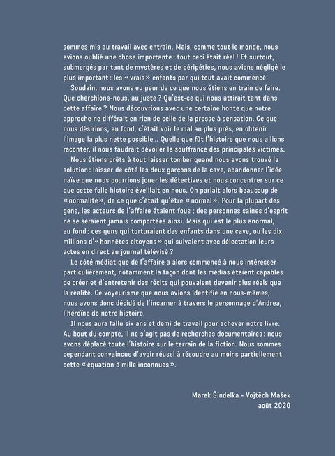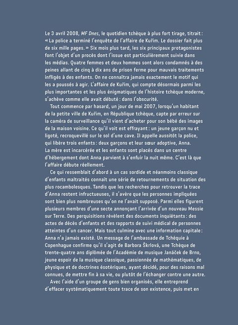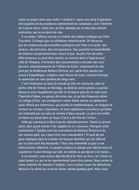 Mai 2007, République tchèque. Le bug d’un baby-phone permet à un homme d’intercepter les images d’un gamin couché sur le sol d’une maison voisine, nu et menotté. La mère de l’enfant est arrêtée, inculpée d’activités pédopornographiques. Anna, 13 ans, l’une de ses filles présumées, parvient à s’enfuir. L’enquête policière montrera qu’il s’agit en fait d’une femme de 33 ans, Barbora Škrlová, qui a subi opérations, entraînement et régime pour se transformer en fillette. Son père, ancien chef d’une troupe scoute d’extrême-droite, est-il lié à l’affaire ? Les mobiles sont-ils sexuels ou sectaires ? L’opinion et les médias tchèques s’enflamment pour le scandale. Quelques mois plus tard, Barbora Š. est retrouvée en Norvège sous l’identité d’Adam, un garçon de 13 ans. Rapatriée en Tchéquie, elle est inculpée de plusieurs crimes. L’affaire, jamais complètement élucidée, conduira à l’adoption de nouvelles lois sur la protection des victimes d’actes criminels.