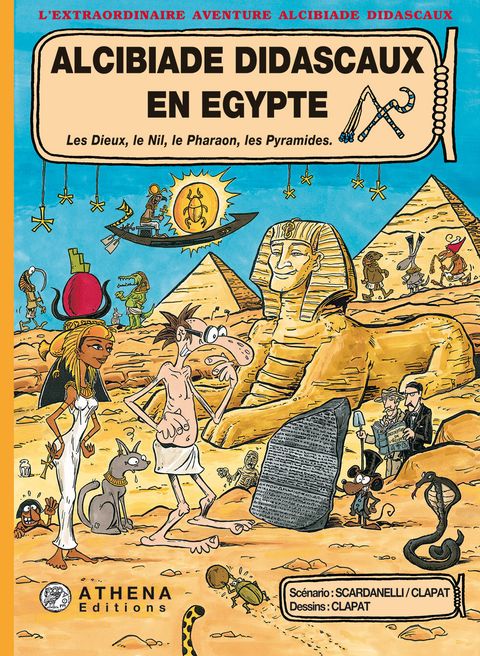 Sur les traces de Champollion, Alcibiade Didascaux se rend en Egypte afin de retrouver les racines de notre civilisation. L'hellénisme qui nous a S tant apporté doit en fait beaucoup à l'Égypte. Notre professeur de Lettres en est convaincu et il souhaite communiquer son savoir à ses élèves. Notre sympathique héros est cette fois-ci parvenu à échapper à l'inquiétante machine à remonter le temps de son collègue de Physique, Agénor. Mais voilà que dans le désert, Alcibiade rencontre un étrange égyptologue qui lui offre un fort curieux cigare. Notre héros se trouve alors mystérieusement projeté dans les méandres du temps et découvre avec nous le fantastique panthéon de la mythologie égyptienne. L assiste émerveillé à la naissance du monde et revit l'histoire de Rê le dieu-soleil, la légende d'Isis et Osiris, le combat éternel entre IHorus, les forces de la lumière, contre Seth, les forces des ténèbres et du désordre cosmique. Parcourant peu après le monde fabuleux des pharaons, Alcibiade Didascaux découvre les bienfaits du Nil nourricier et nous explique pourquoi l'Égypte est un don du Nil. Il participe à la construction des pyramides, nous dévoile le sens de ces tombeaux et fait un voyage au pays des morts. Ce premier tome se termine avec l'étrange histoire du livre magique de Thot, que nul ne doit lire.