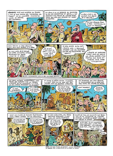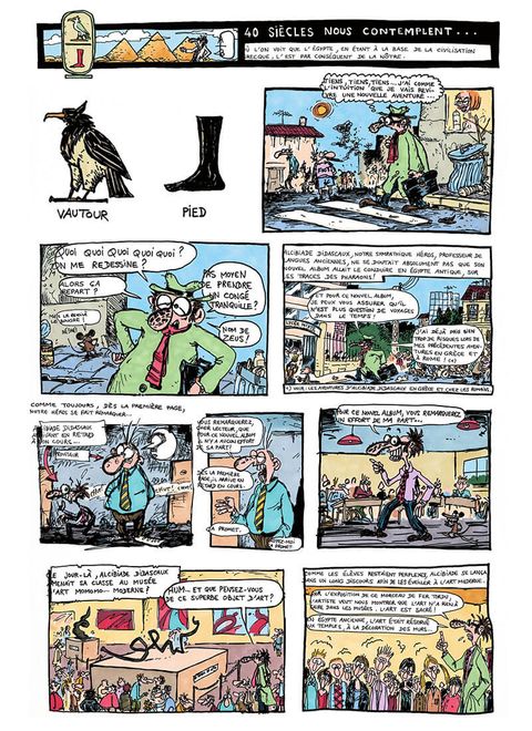 Sur les traces de Champollion, Alcibiade Didascaux se rend en Egypte afin de retrouver les racines de notre civilisation. L'hellénisme qui nous a S tant apporté doit en fait beaucoup à l'Égypte. Notre professeur de Lettres en est convaincu et il souhaite communiquer son savoir à ses élèves. Notre sympathique héros est cette fois-ci parvenu à échapper à l'inquiétante machine à remonter le temps de son collègue de Physique, Agénor. Mais voilà que dans le désert, Alcibiade rencontre un étrange égyptologue qui lui offre un fort curieux cigare. Notre héros se trouve alors mystérieusement projeté dans les méandres du temps et découvre avec nous le fantastique panthéon de la mythologie égyptienne. L assiste émerveillé à la naissance du monde et revit l'histoire de Rê le dieu-soleil, la légende d'Isis et Osiris, le combat éternel entre IHorus, les forces de la lumière, contre Seth, les forces des ténèbres et du désordre cosmique. Parcourant peu après le monde fabuleux des pharaons, Alcibiade Didascaux découvre les bienfaits du Nil nourricier et nous explique pourquoi l'Égypte est un don du Nil. Il participe à la construction des pyramides, nous dévoile le sens de ces tombeaux et fait un voyage au pays des morts. Ce premier tome se termine avec l'étrange histoire du livre magique de Thot, que nul ne doit lire.