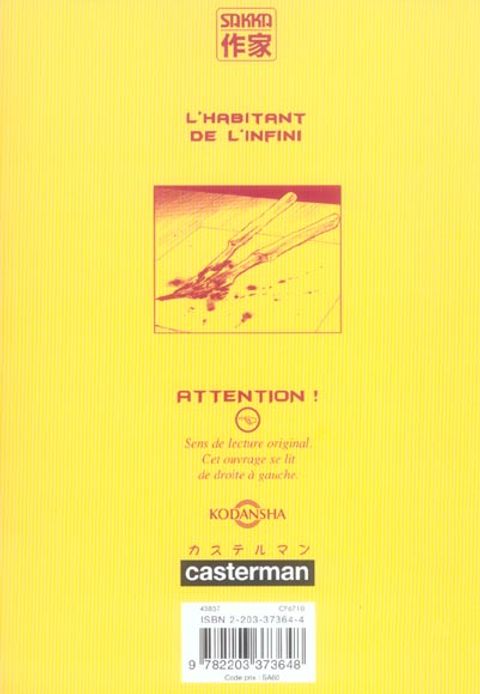 Prisonnier du Mugaïryû, Manji sert de cobaye à Burandon Ayame, jeune médecin au service du clan. Condamné par le Shôgunat pour avoir tenté de sortir clandestinement du pays afin de découvrir la médecine occidentale, Ayame tente, sur ordre de Habaki, de découvrir si le pouvoir de régénération de Manji est transmissible.