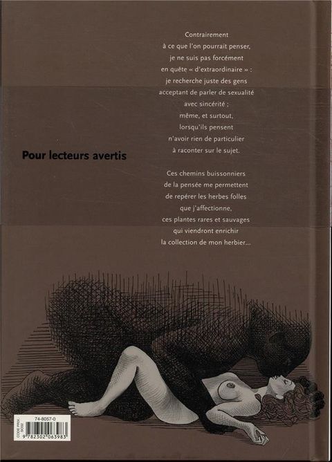 Ne vous y trompez pas... Même si cet Herbier sauvage pourrait donner l'impression que de parfaits inconnus - femmes et hommes de tous âges - ont soudainement dévoilé leur vie sexuelle sans inhibition, il n'en est rien. Après avoir pris contact avec ses interlocuteurs, Fabien Vehlmann leur donne rendez-vous dans un lieu de leur choix, généralement un café. Parfois, il peut lui arriver d'utiliser un jeu de cartes « questions/réponses », réalisé pour l'occasion, qui lui permet d'entrer plus rapidement dans le vif du sujet : à lui de débusquer - au milieu du foisonnement de souvenirs évoqués - le détail intriguant, la formulation juste, le mot frappant, la pensée originale, l'expérience édifiante. Ces chemins buissonniers de la pensée permettent in fine de repérer les herbes folles, ces plantes rares et sauvages qui enrichissent cet herbier, illustré de manière charnelle, sensuelle et/ou surréaliste par le talentueux David Prudhomme.