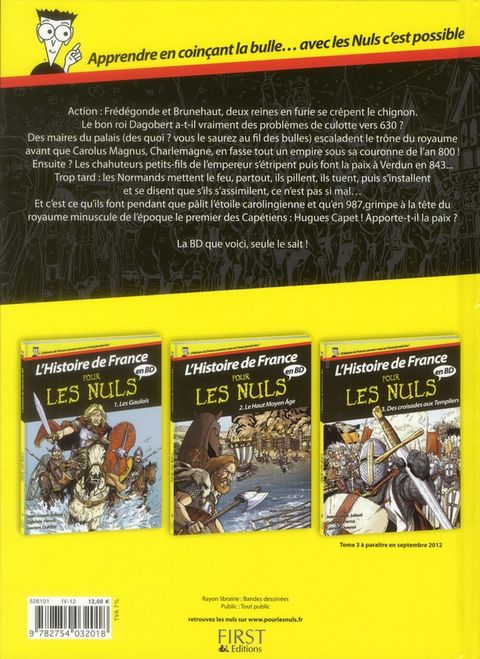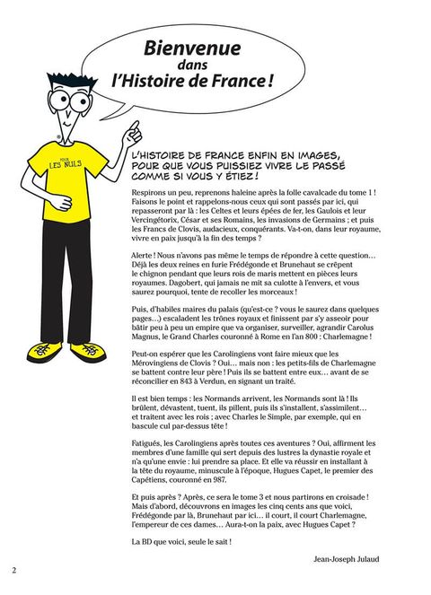 La collection « Pour les Nuls » vous propose un rendez vous avec l'Histoire de France pour découvrir les moments forts de notre passé, pour comprendre les grands évenements et se repérer dans notre histoire de façon claire, ludique et didactique. De Vercingétorix à François Ier, de Louis XIV au Général de Gaulle, suivez-nous pour un grand voyage dans le temps : l'Histoire de France, des premiers hommes à nos jours, magnifiquement dessinée par Vincenzo Acunzo et scénarisée par Hervé Loiselet, l'adaptation en bande dessinée du best-seller de Jean-Joseph Julaud, L'Histoire de France en bande dessinée pour les Nuls vous invite à réviser vos classiques. Le tome 2 de cette série traite les personnages historique suivants : Frédégonde et Brunehaut, Dagobert, Charlemagne, Traité de Verdun, Charles le Chauve, roi de la Francia occidentalis, Hugues Capet. Suivez le guide ! le « Dummies Man », la mascotte de la collection «Pour les Nuls» vous guidera à travers les heures glorieuses ou sombres de notre Histoire. En prime, à la fin de l'album, un cahier de 8 pages écrit par Jean-Joseph Julaud vous permettra d'approfondir vos connaissances sur la période concernée.