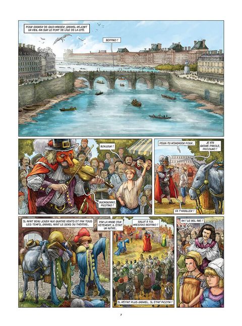 Chaque matin, Gabriel quitte le misérable réduit qu’il occupe sur les bords de la Seine et retrouve l’effervescence du Pont-Neuf. Là, parmi les bonimenteurs et les vendeuses de fleurs, il improvise quelques scènes de commedia dell’arte pour gagner de quoi se nourrir. A l’écart, Molière l’observe… Et décide de l’engager dans sa compagnie. Désormais, le rêve le plus fou de Gabriel semble possible : jouer avec Molière devant le Roi-Soleil.