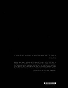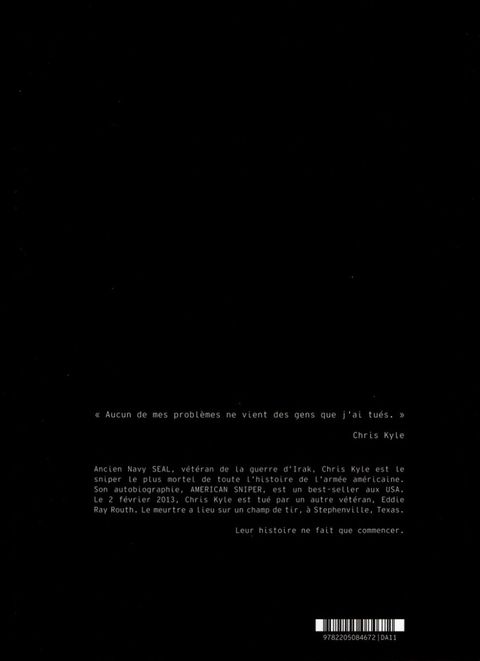 Chris Kyle est un héros. Ancien sniper chez les Navy Seals durant la deuxième guerre d'Irak, il a tué plus de 160 « cibles ». Au faîte de sa gloire (Clint Eastwood a même acheté les droits de son autobiographie, bestseller aux États-Unis, pour en faire un film ? ce sera "American Sniper"), Chris Kyle dédie sa vie à aider ses anciens camarades de combats marqués aussi bien physiquement que mentalement par la guerre. Eddie Ray Routh est l'un d'entre eux. Le 2 février 2013, l'inconnu EDDIE RAY ROUTH abat la Légende Chris Kyle. Ce livre raconte l'histoire raconte le crime ? et ses conséquences.
