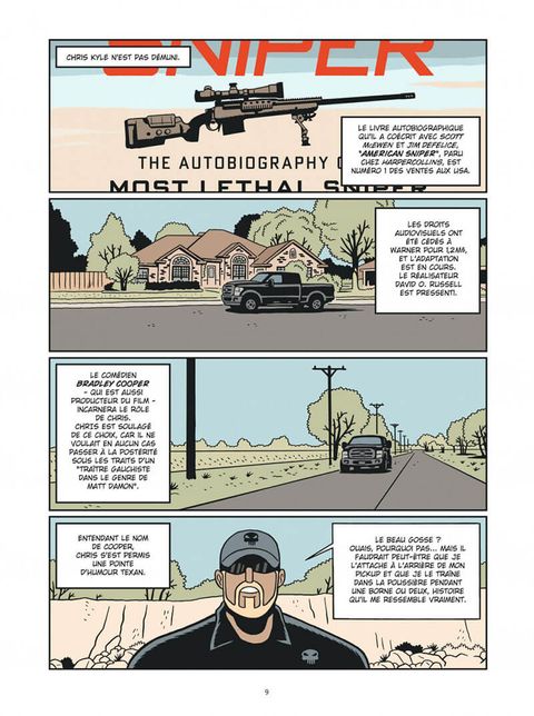 Efficace comme toujours ! Une bd documentaire sur le célèbre américan snipper, et les contradictions de notre monde. Je recommande vivement. Pour les fans de nury et Bruno, et pour ceux qui ne connaissent pas encore ! Je recommande vivement