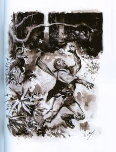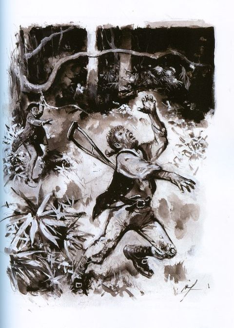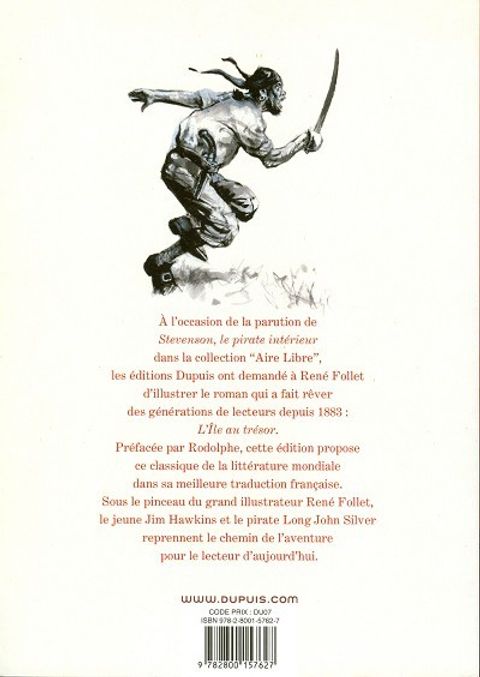 C'est en 1945 que René Follet, alors tout jeune débutant âgé de 15 ans, reçoit sa première commande d'un éditeur. Il s'agit d'illustrer pour la marque de chocolats belges Aiglon un roman pour la jeunesse. Le jeune René fournit les crayonnés de 60 chromos. Ceux-ci, imprimés sous forme de vignettes, sont donnés à l'achat de chocolats, pour être collés ensuite dans un album. Ce roman, c'est "L'île au trésor" de Robert Louis Stevenson. Ainsi débute sous les meilleurs auspices la carrière du plus flamboyant des illustrateurs réalistes belges de la seconde moitié du XXe siècle. Un peu plus de 50 ans plus tard, René Follet retrouve Robert Louis Stevenson sur sa table à dessin grâce au scénario que Rodolphe consacre à ce génie de la littérature mondiale. À l'occasion de la parution de cette biographie en bande dessinée ciselée pour la collection Aire Libre, Stevenson, le pirate intérieur, les Éditions Dupuis ont demandé à René Follet de revenir sur les traces de son adolescence en illustrant à nouveau cette "Île au trésor" qui a fait rêver des générations de lecteurs depuis 1883. Préfacée par Rodolphe, cette édition propose le roman dans sa meilleure traduction, celle du surréaliste Théo Varlet, et est accompagnée de 6 fresques au lavis de René Follet. Sous le pinceau du grand illustrateur, le jeune Jim Hawkins et le pirate Long John Silver reprennent le chemin de l'aventure !