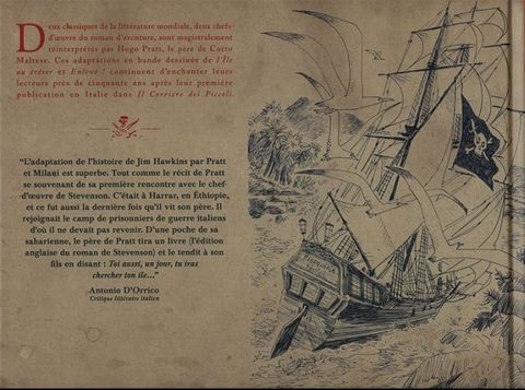 Mis en images dans les années soixante avant Corto, sur une adaptation signée Mino Milani, le classique de Robert-Louis Stevenson revisité par Hugo Pratt n'était plus guère disponible. Sa dernière édition française, datée de la fin des années 80, était pratiquement épuisée. Voici donc L'Île au trésor à nouveau dans l'actualité, cette fois dans un format à l'italienne en deux strips déjà rodé avec la publication récente de Sandokan du même Hugo Pratt. Une nouvelle édition significativement enrichie, puisque s'ajoute à L'Île au trésor une seconde histoire de Stevenson, Kidnappé ! Spécialement mise en couleur pour l'occasion. L'ouvrage, comme les nouvelles éditions des albums Corto Maltese, est assorti d'une préface.