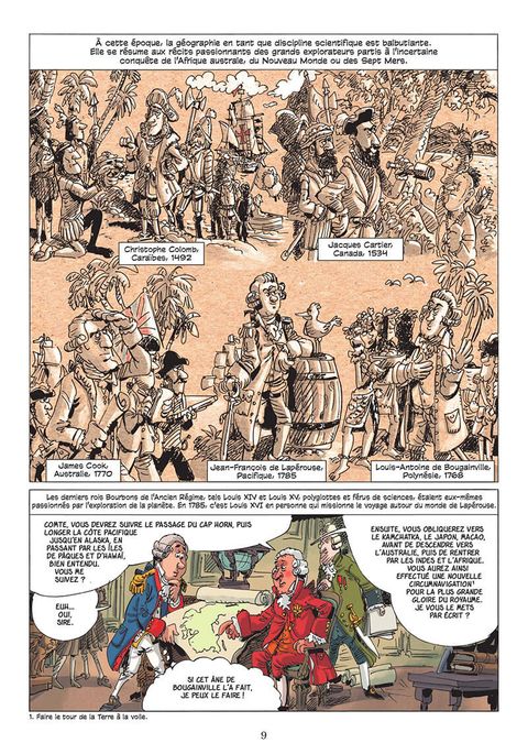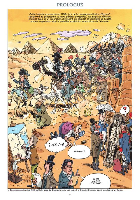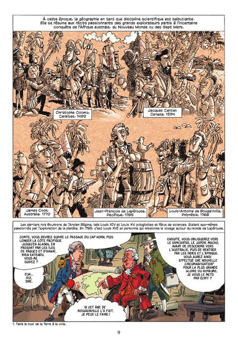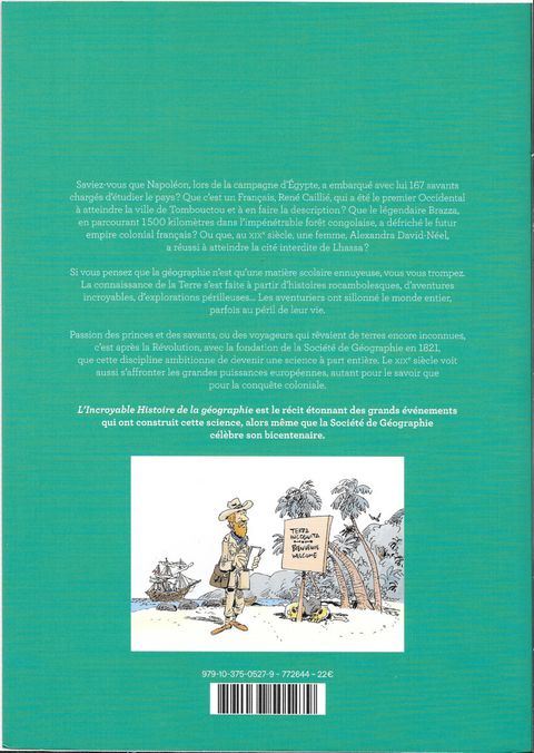 De Brazza au Congo en passant par Dumont d’Urville en Antarctique jusqu’à Sylvain Tesson en Asie, cette bande dessinée embarque petits et grands sur les traces des grands voyageurs, à la découverte du monde. L’Incroyable Histoire de la géographie est le récit des grandes expéditions qui ont donné naissance à cette science. Une coédition avec la Société de Géographie. Saviez-vous que Napoléon, lors de la campagne d’Égypte, a embarqué avec lui 167 savants chargés d’étudier le pays ? Que c’est un Français, René Caillié, qui a été le premier Occidental à atteindre la ville de Tombouctou et à en faire la description ? Que le légendaire Brazza, en parcourant 1 500 kilomètres dans l’impénétrable forêt congolaise, a défriché le futur empire colonial français ? Ou que, au XIXe siècle, une femme, Alexandra David-Néel, a réussi à atteindre la cité interdite de Lhassa ? Passion des princes et des savants, ou des voyageurs qui rêvaient de terres encore inconnues, c’est après la Révolution, avec la fondation de la Société de Géographie en 1821, que cette discipline ambitionne de devenir une science à part entière.
