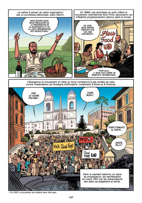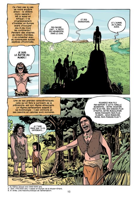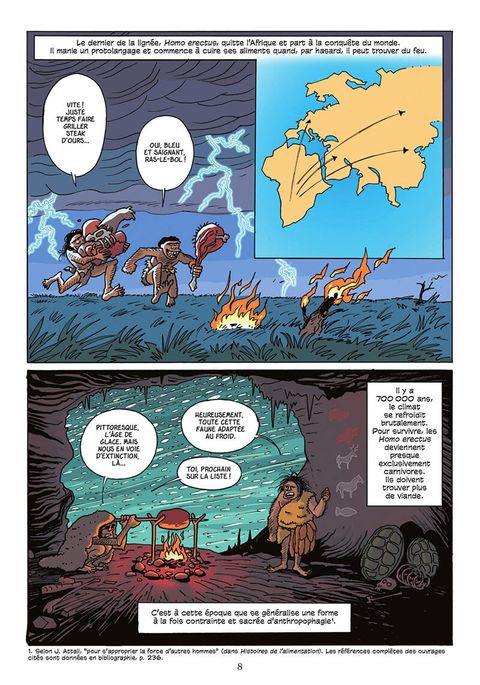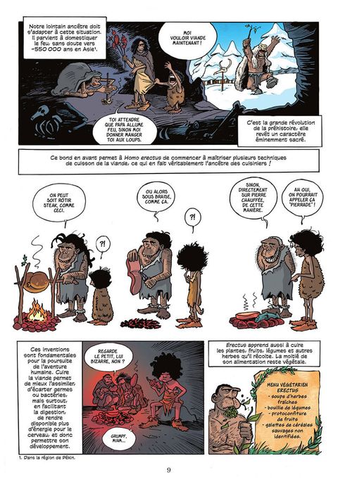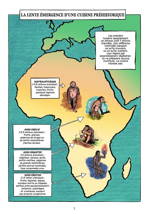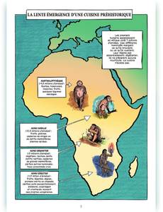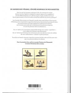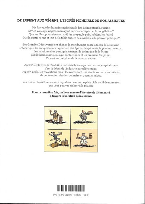 L´histoire de l’humanité à travers l’évolution de la cuisine. Dès lors que les humains maîtrisent le feu, ils inventent la cuisine. Saviez-vous que Sapiens a imaginé la cuisson vapeur et la congélation ? Que les Mésopotamiens ont créé les soupes, le pain, la bière, les fours ? Que la gastronomie et l’art de la table ont été des symboles du pouvoir politique ? Les Grandes Découvertes ont changé le monde, mais aussi la façon de se nourrir. D’Amérique, les conquistadors rapportent des épices, des piments, la pomme de terre… Les missionnaires portugais amènent la technique de la friture aux lointains samouraïs qui confectionnent les premiers tempuras. Ce sont les prémices de la mondialisation. Au XIXe siècle avec la révolution industrielle émerge une cuisine « capitaliste » : c’est le début de l’industrie agroalimentaire. Au xxie siècle, les révolutions bio et locavores sont une réaction contre les méfaits de cette uniformisation culinaire et gastronomique. Vingt-deux recettes de plats cités au fil du récit
