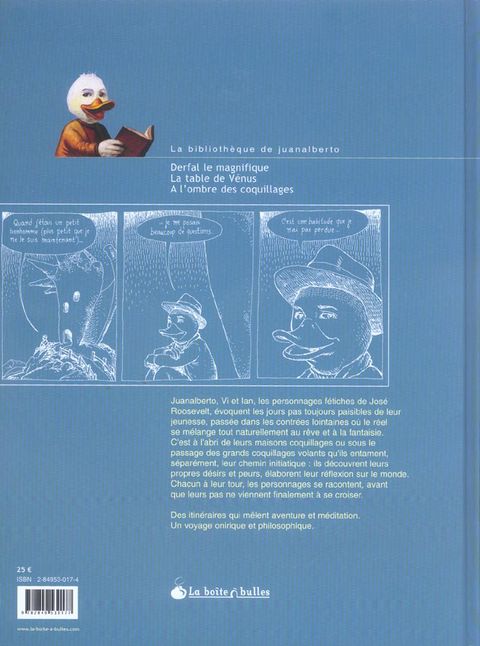 Pour cet album, trois histoires parallèles, celles de Juanalberto, Vi et Ian. Ils évoquent les grandes périodes de leur vie en s'attardant particulièrement sur leur jeunesse. Roosevelt présente un scénario original empli de poésie dans un décor surprenant. L'histoire passionnante nous transporte à travers le destin troublé de ses personnages attachants et aborde différents aspects de l'Art dans un monde où ce dernier est particulièrement tombé en désuétude. Le dessin éloquent de Roosevelt illumine le récit et accentue l'atmosphère onirique de l'album. Une bande dessinée indispensable qui séduira bon nombre de lecteurs.
