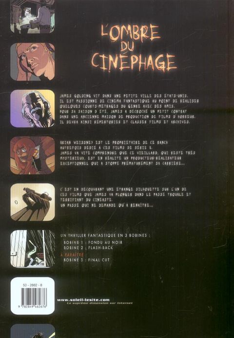 DANS UN UNIVERS PROCHE DE CEUX DE KING, CARPENTER OU HITCHCOCK, GAUDIN SIGNE AVEC L'OMBRE DU CINÉPHAGE, UN THRILLER FANTASTIQUE, HOMMAGE AU CINÉMA DU GENRE ! À 20 ans, James Golding, réalisateur passionné par le cinéma fantastique, débute sa carrière, avec un parfum d'amertume : son film manque de peu le prix du public. À l'approche de l'été, il trouve un stage auprès d'un réalisateur expérimenté, Brian Weissney. Mais très vite, il est témoin d'étranges événements. De nombreuses zones d'ombre entourent la famille de son employeur. Ce dernier lui confie soudain que sa femme entretenait une liaison avec Georges Bentley, un acteur au talent presque diabolique. En proie à des cauchemars de plus en plus réels, James est inexorablement attiré par le hangar désaffecté... Y trouvera-t-il les prémices d'une réponse à ses angoisses oe