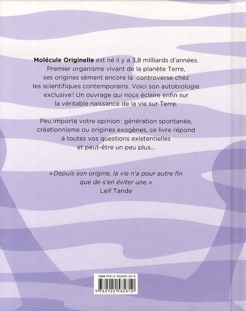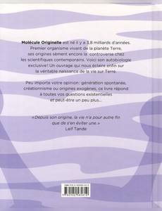 Molécule Originelle est né il y a 3,8 milliards d'année. Il fut le premier organisme vivant de la planète Terre. Bien que ses origines soient encore controversées par les scientifiques contemporains, nous avons droit à son autobiologie qui nous éclaire enfin sur la véritable naissance de la vie sur Terre. Peu importe votre opinion, génération spontanée, créationnisme ou origines exogènes, Molécule répond à toutes vos questions existentielles et peut-être un peu plus... Molécule c'est aussi un web-comic que l'auteur a tenu pendant 365 jours sur internet en 2008. Ce livre sera le plus imposant que nous ayons publié jusqu'à ce jour : 376 pages sous couverture cartonnée ! Un pavé ! Et une expérience de lecture étonnante comme Leif Tande nous a habitué.