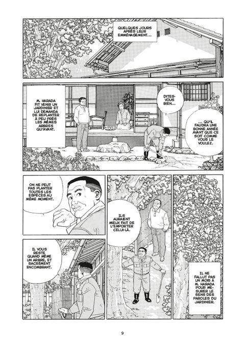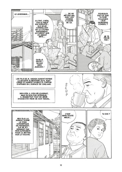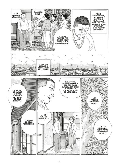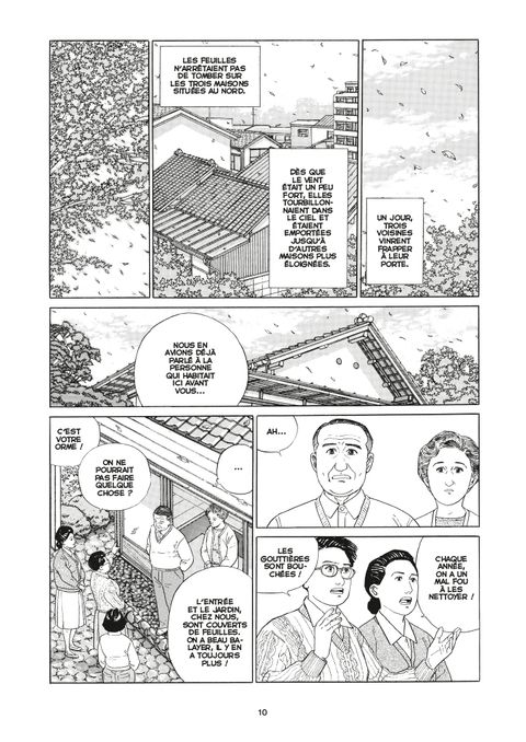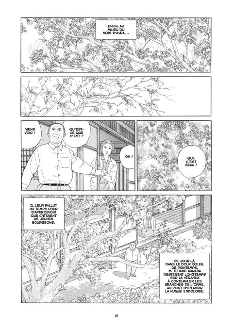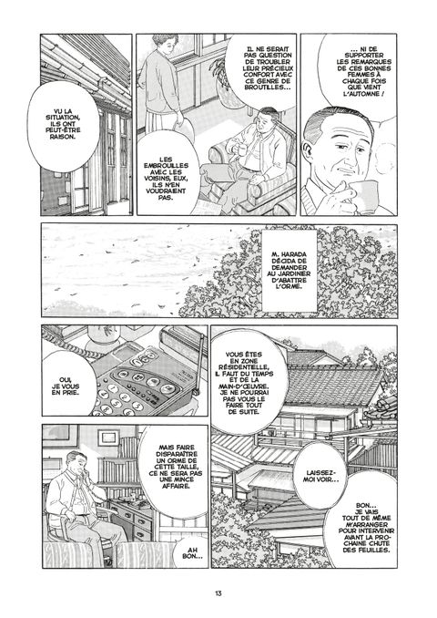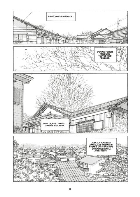 Chacune des nouvelles de ce recueil retrace une tranche de vie. Avec délicatesse, et par petites touches, Jirô Taniguchi campe des portraits de jeunes, de vieux, d'enfants à un moment difficile de leur existence. Comme la petite Hiromi, confiée provisoirement par sa maman à ses grands-parents, qui est terrorisée à l'idée d'être abandonnée. Ou comme M. Harada qui ne se résout pas à faire couper cet orme si beau et aux couleurs si subtiles, au simple prétexte qu'en automne, ses feuilles tombent dans la cour des voisins. Ou encore M. Iwasaki qui, par le plus pur des hasards, retrouve sa fille de 25 ans qu'il avait quittée alors qu'elle était encore bébé. Il finit par l'aborder, mais n'ose pas lui révéler son identité. Une nouvelle démonstration du très grand talent de Taniguchi, tout en pudeur et en sensibilité.