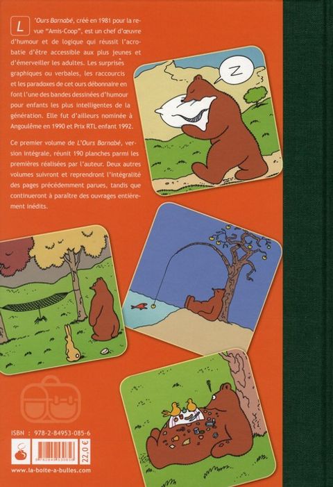 L'Ours Barnabé, créé en 1981 pour la revue "Amis-Coop", est un chef d'oeuvre d'humour et de logique qui réussit l'acrobatie d'être accessible aux plus jeunes et d'émerveiller les adultes. Les surprises graphiques ou verbales, les raccourcis et les paradoxes de cet ours débonnaire en font l'une des bandes dessinées d'humour pour enfants les plus intelligentes de la génération. Elle fut d'ailleurs nominée à Angoulême en 1990 et Prix RTL enfant 1992. Ce premier volume de L'Ours Barnabé, version intégrale, réunit 190 planches parmi les premières réalisées par l'auteur. Deux autres volumes suivront et reprendront l'intégralité des pages précédemment parues, tandis que continueront à paraître des ouvrages entièrement inédits.