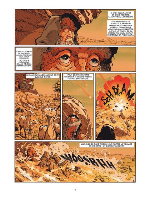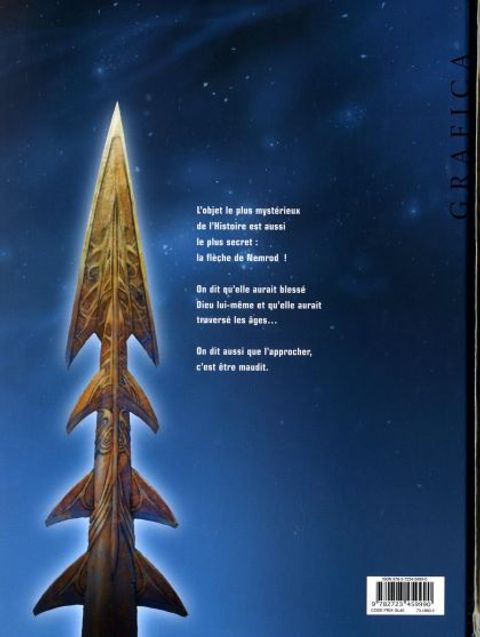Du XXVIe siècle avant J.-C. jusqu'en 2129, partez sur les traces de la plus puissante des armes : la flèche de Nemrod ! Une ambitieuse saga en sept tomes imaginée par Bollée, scénariste d' Apocalypse Mania, et dessinée par riffGo, Goepfert, Aymond, Mangin, Meddour et Héloret. Elle a décapité des rois, maté des peuples, fait défaillir de terreur des guerriers qui se seraient pourtant damnés pour avoir l'honneur de la porter. Elle est la flèche de Nemrod. L'arme la plus puissante du monde. Dont on dit qu'elle blessa jusqu'à Dieu, qui laissa sur sa pointe une trace de son sang... XXe siècle après J.-C. Année 2129. La Terre vit un jour historique avec l'inauguration dans son orbite de la plate-forme spatiale Hadden, premier siège social de l'humanité installé dans l'espace. Arthur Witzler, l'homme le plus riche du monde, qui a financé une bonne partie de ce gigantesque projet, contemple ce qui sera vraisemblablement sa dernière grande réalisation. Car le puissant magnat, âgé de 80 ans, s'apprête à confier son empire à Olin Browne, un jeune loup prétentieux qui l'a d'ores et déjà convaincu de fermer la Fondation Witzler, une étrange organisation chargée de recenser tous les mystères de la Terre depuis l'origine des temps. Sacrifié sur l'autel de la rentabilité, la Fondation, qui n'est jamais parvenu à découvrir le moindre phénomène inexplicable à la lumière de l'intelligence humaine, s'apprête donc à vivre ses dernières heures. Jusqu'à ce qu'une jeune psychiatre suédoise la contacte pour lui parler d'un étrange patient, découvert dans les tréfonds de l'établissement spécialisé où elle travaille. L'homme, qui porte le numéro 1167, semble doté de particularités tout à fait incroyables. Il serait en effet capable de défier la marche du temps. Et serait dépositaire de bien des secrets. Des secrets autour de vieilles légendes. Où il serait question du sang de Dieu... Arthur Witzler réunit immédiatement les baroudeurs et hercheurs chevronnés qui composent sa Fondation. Une terrible et grande aventure vient de commencer...